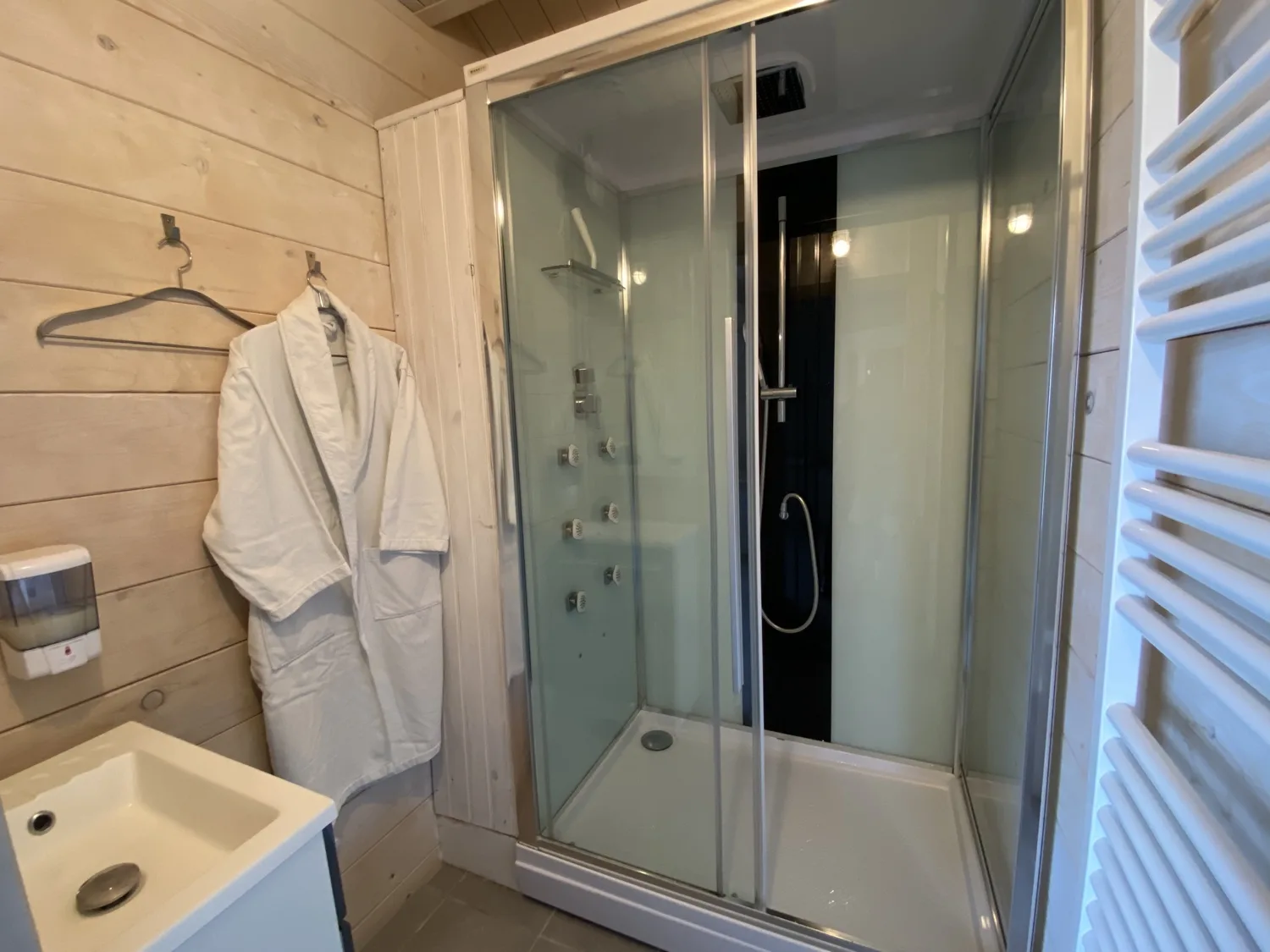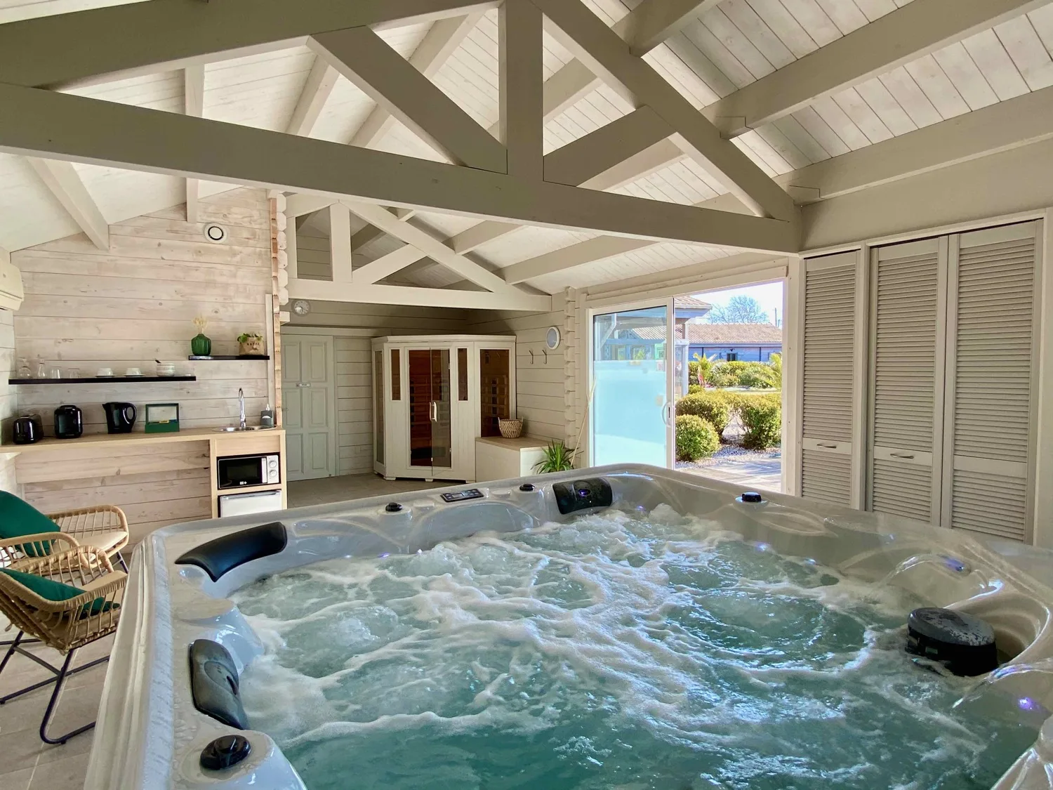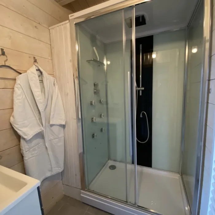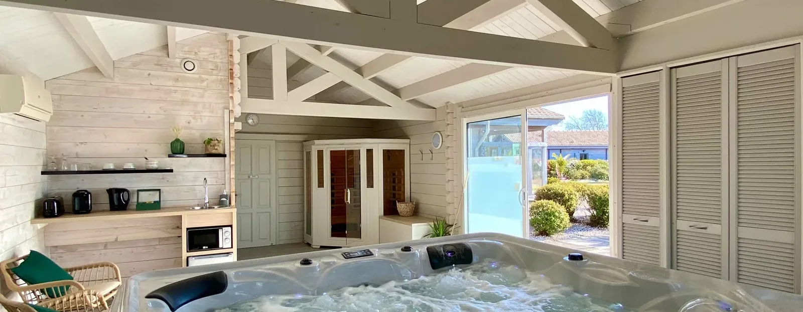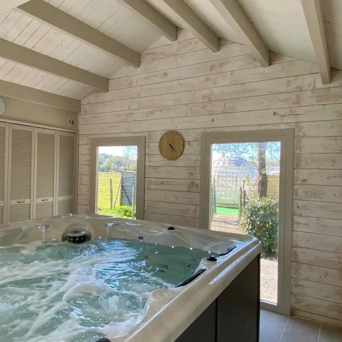 Détail des équipements : Spa privatif, Sauna à infrarouge privatif, lit double, salle d’eau, WC indépendant, coin petit déjeuner (mini réfrigérateur, micro-ondes, grille-pain, bouilloire et cafetière Tassimo), draps, serviettes de toilette et peignoirs.