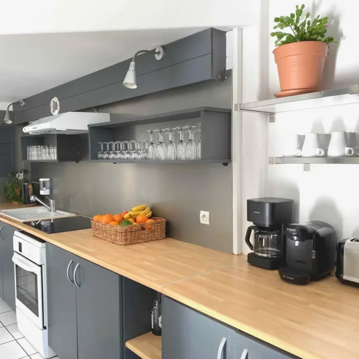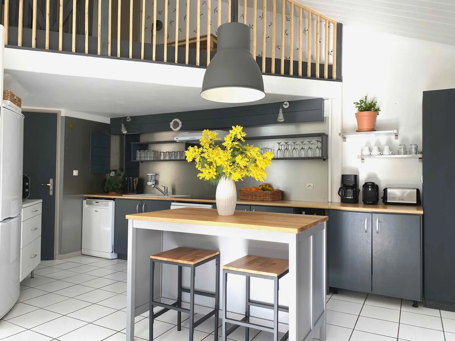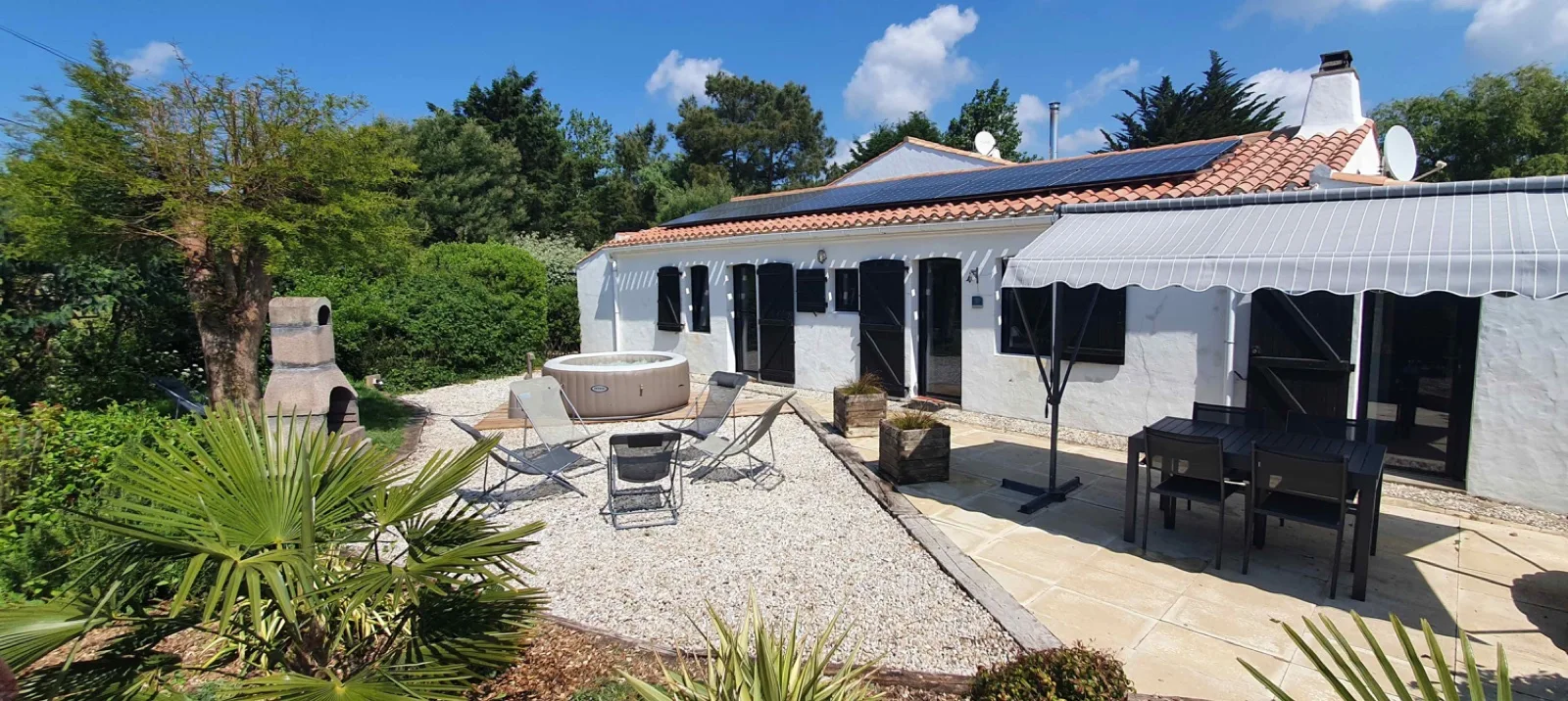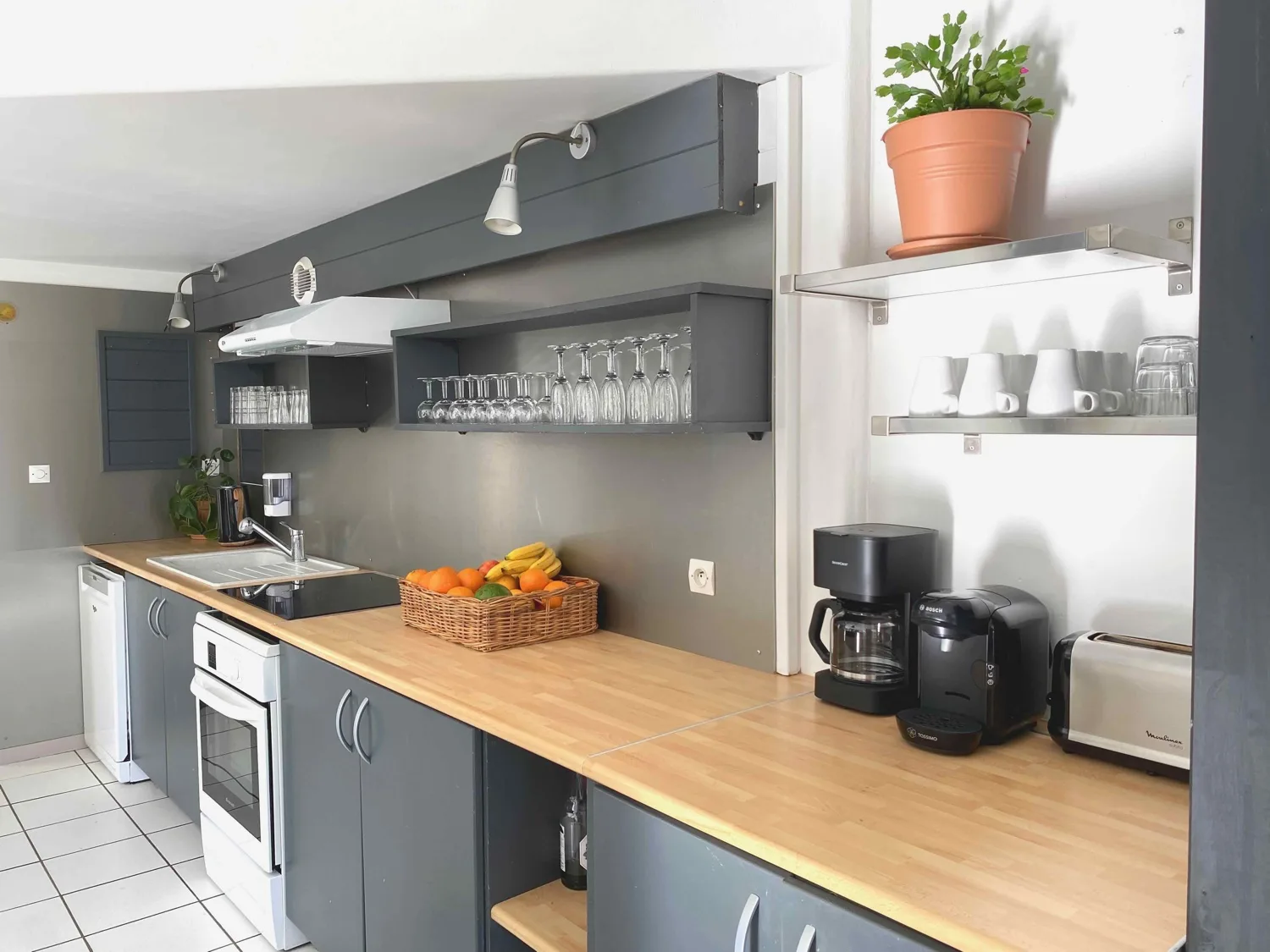 Détail des équipements : Lave-vaisselle, Lave-linge, Réfrigérateur-congélateur, Plaques de cuisson à induction, Four électrique, Micro-ondes, Cafetière filtre et Tassimo, Bouilloire, Grille pain, Télévision à écran plat, Barbecue, Balançoire, table de ping-pong et Spa privatif Intex.