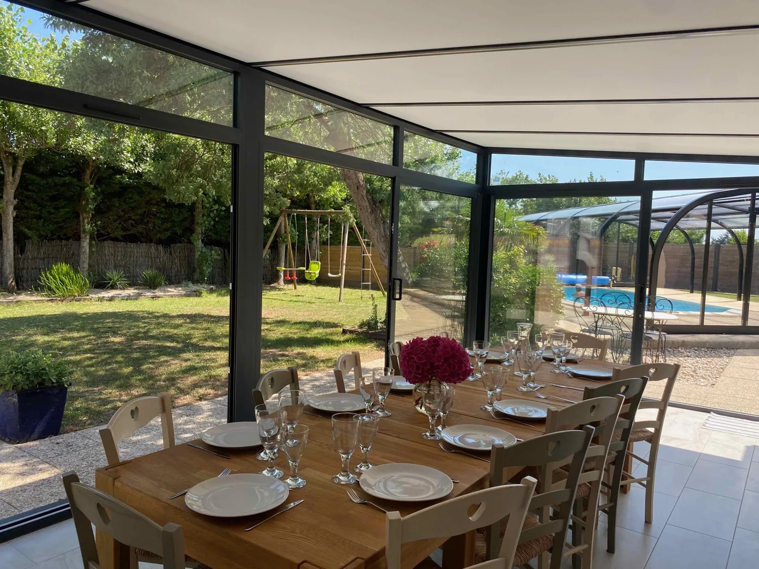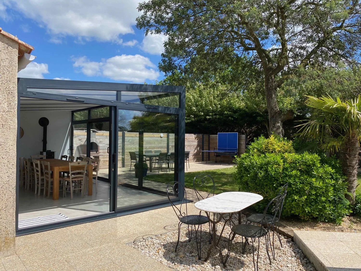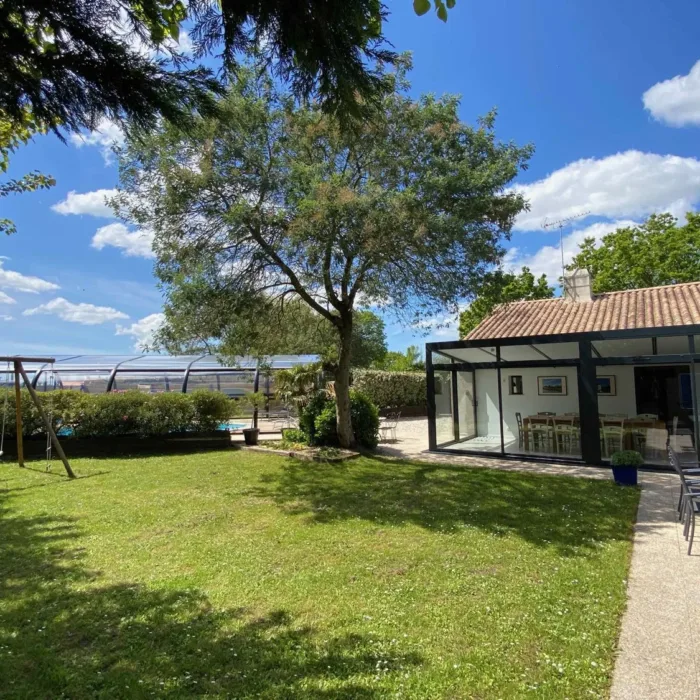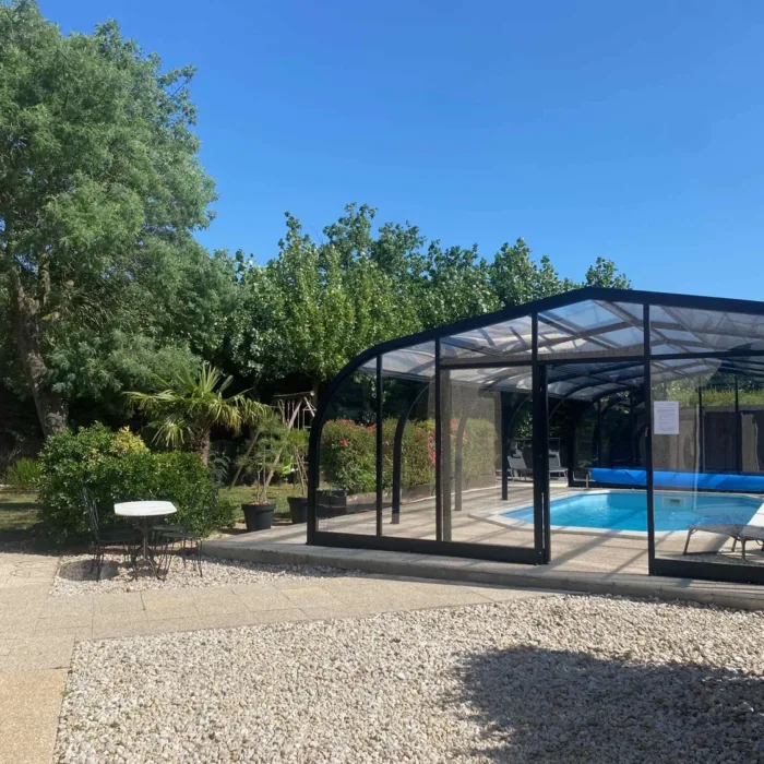 La Grange est un hébergement au confort moderne de 135 m2 classé 4*. Ce gîte dispose d’une pièce de vie avec plafond cathédrale, poêle à bois et cuisine ouverte. L’espace repas situé dans la véranda est adapté pour 12 personnes à table. Son jardin de 500 m2 avec terrasse et pergola est arboré et entièrement clôturé. La piscine privée de 7,5m x 3,8m est couverte et chauffée d’avril à octobre. Ce gîte comporte 4 chambres doubles dont 2 mansardées à l’étage.